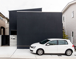 深い色味が印象的なカッコいい外観。道路面には窓は作らず、人の目が届かない部分に窓を大きく取り、プライバシーと明るさを確保しています。