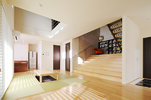 開放感たっぷりの吹き抜けに、緩やかな大階段。ベンチ代わりにしたり、ちょっとした作業スペースにしたりと、触れ合える場になる階段です。